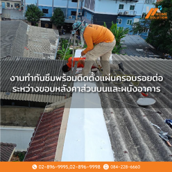งานทำกันซึมพร้อมติดตั้งแผ่นครอบรอยต่อระหว่าหลังคาส่วนบนและผนังอาคาร